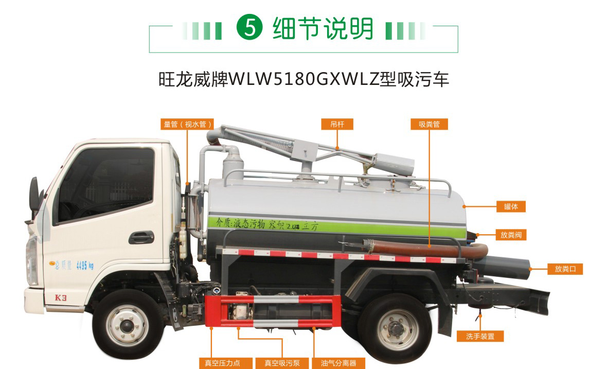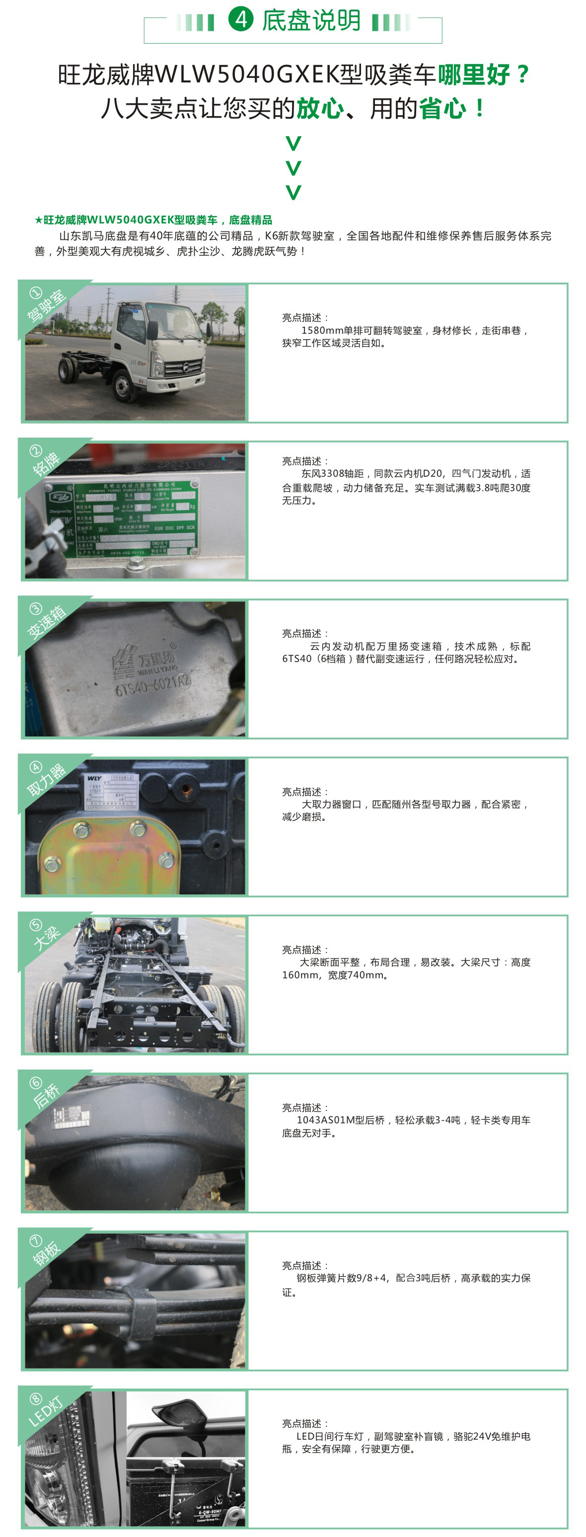 ①底盤:旺龍威牌WLW5040GXEK型吸糞車的發(fā)動(dòng)機(jī)是大馬力發(fā)動(dòng)機(jī)