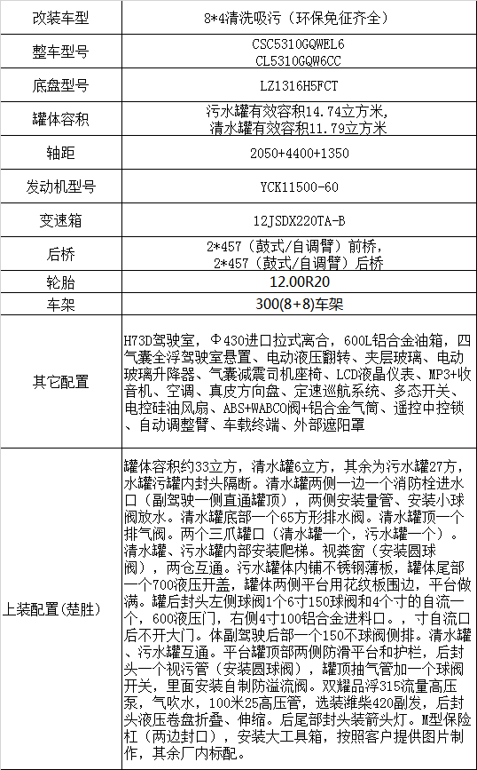 2*457前橋,后橋2*457鑄鋼/4.875,發(fā)動(dòng)機(jī)YCK11500-60,12JSDX220TA-B,Ф430拉式離合,板簧11/11/13,300(8+8)車架,600L鋁合金油箱,國(guó)產(chǎn)方向機(jī),12.00R20,全氣囊駕駛室懸置、電動(dòng)液壓翻轉(zhuǎn)、夾層玻璃、電動(dòng)玻璃升降器、氣囊減震司機(jī)座椅、金屬漆、電動(dòng)電加熱后視鏡、LCD液晶儀表、自動(dòng)空調(diào)、真皮多功能方向盤、定速巡航系統(tǒng)、多態(tài)開關(guān)、電控硅油風(fēng)扇、WABOC閥(空氣處理單元、駐車手控閥、制動(dòng)總泵)、鋁合金貯氣筒、ABS、中控鎖、自動(dòng)調(diào)整臂、右轉(zhuǎn)提示音響、165AH電瓶、雙騎馬螺栓、行駛記錄儀、MP5、倒車影像、T-BOX