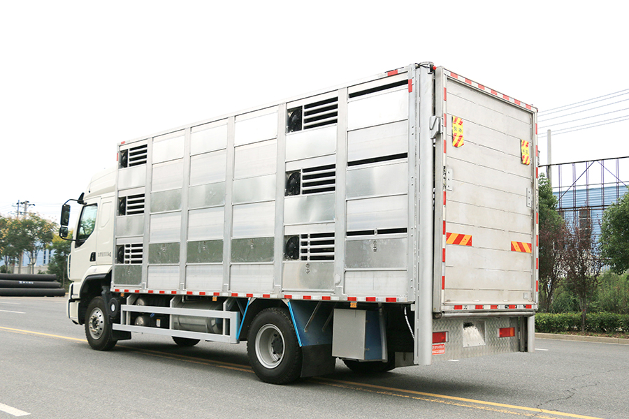 全鋁車身,三層,混合隔倉,可開合側(cè)窗,高轉(zhuǎn)速防水通風(fēng)排氣扇,機組,噴淋,監(jiān)控,垂直升降尾板,空氣過濾,裝豬數(shù)量達(dá)到550頭/7公斤