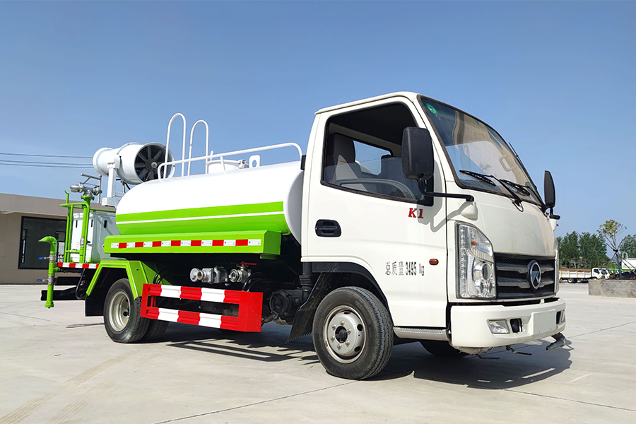 罐體采用標準Q235碳鋼制作,罐體自動焊,裝水3噸,配大功率專用灑水泵,可自吸自排,前沖后灑,側噴,主管道加粗,大通徑球閥,直通球閥式消防接口,帶后工作平臺,帶高炮。尾部大平臺,加裝30米噴霧機。環保、免征齊全。