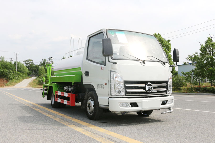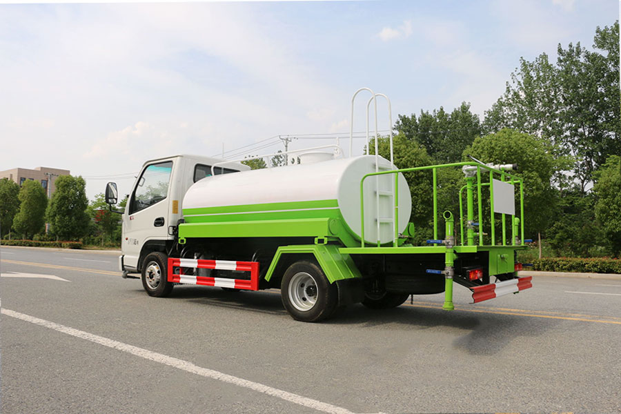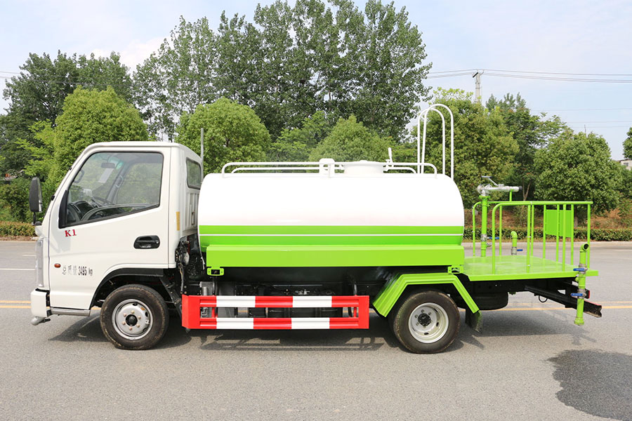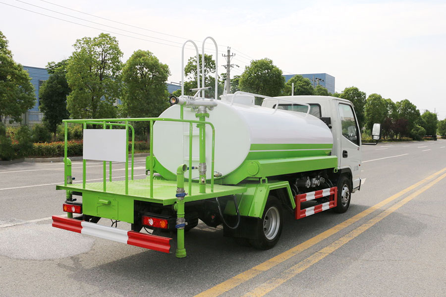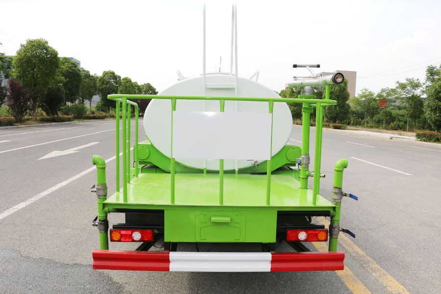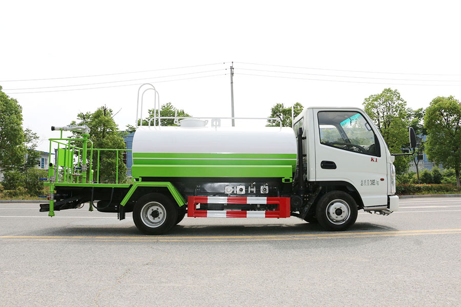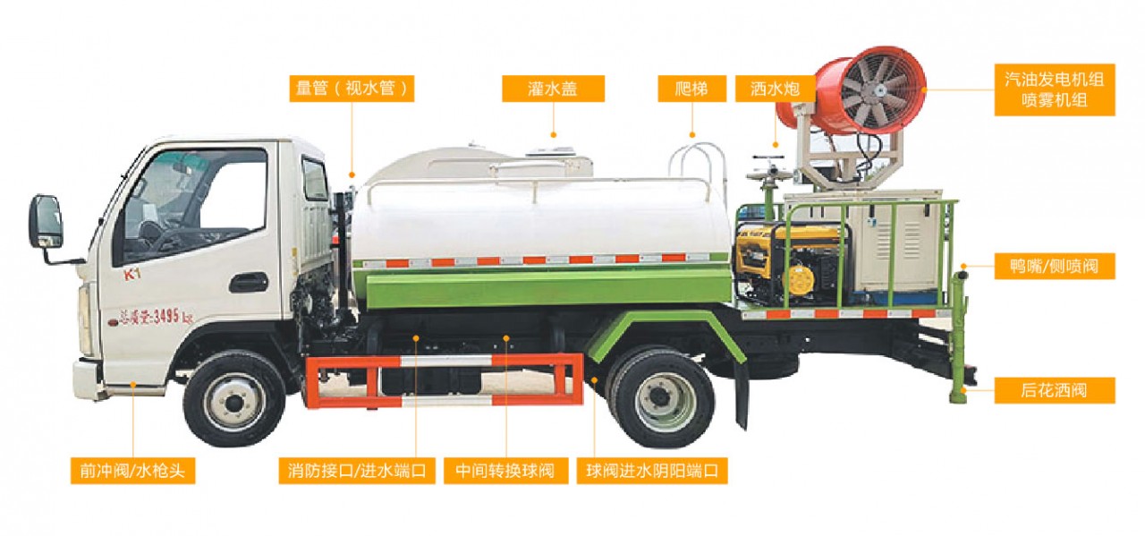 抑塵車前裝有鴨形噴嘴或圓頭沖嘴,后面裝有圓柱開灑水噴嘴或蓮蓬頭噴嘴,后部有一工作平臺(tái),裝配有水炮。噴水器一般用于沖洗街道,起除塵和降溫作用,噴水器可通過調(diào)節(jié)噴嘴螺紋來改變其噴灑方向和角度,高射水炮可以用于城鄉(xiāng)園林綠化及應(yīng)急消防,蓮蓬嘴可以澆落路中間噴水器沖起的灰塵,起到清潔空氣的作用。