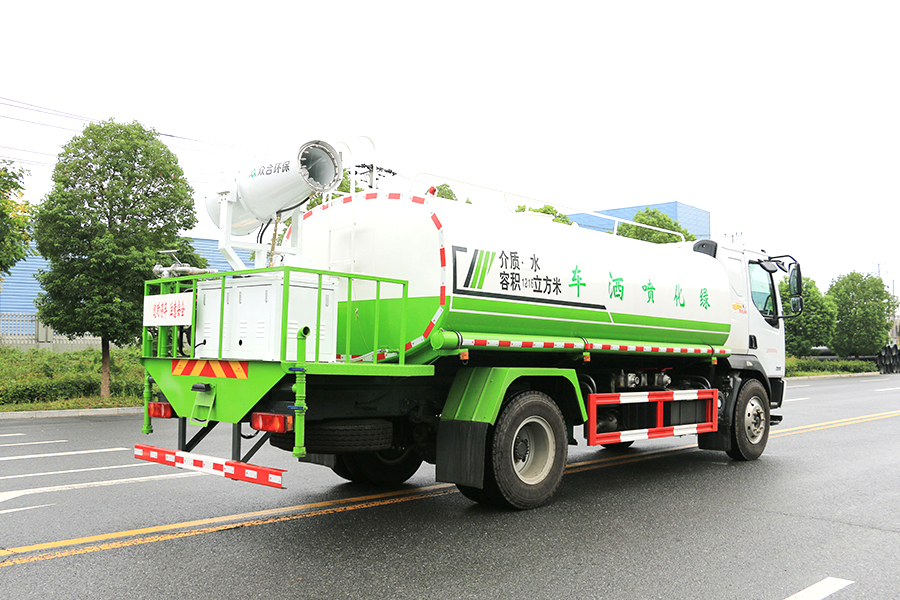 前噴后灑,前裝有鴨形噴嘴或圓頭沖嘴,后面裝有圓柱開(kāi)灑水噴嘴或蓮蓬頭噴嘴,后部有一工作平臺(tái),裝配有高壓水炮。后部還可裝8個(gè)噴嘴(選裝)噴水器一般用于沖洗街道。