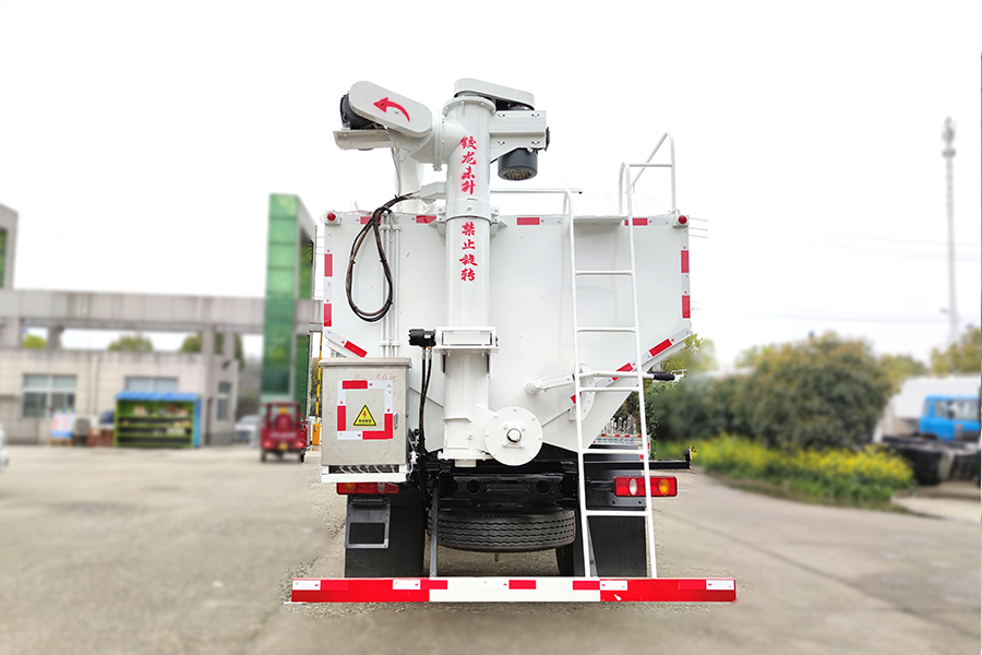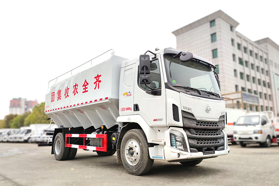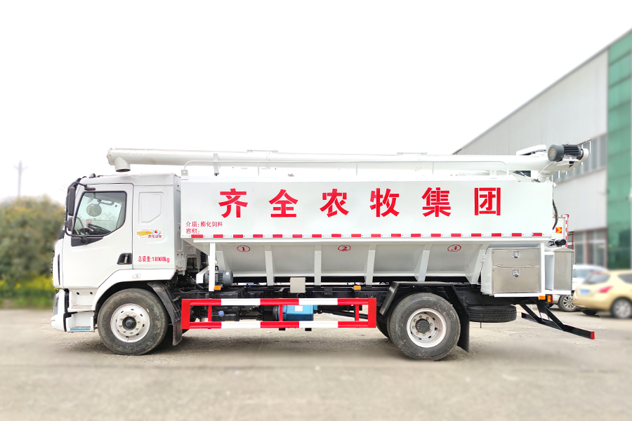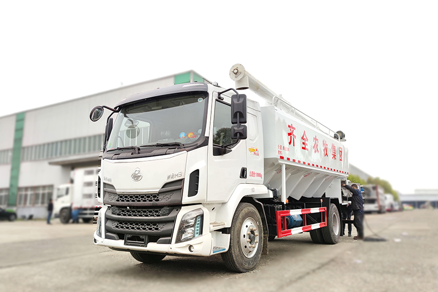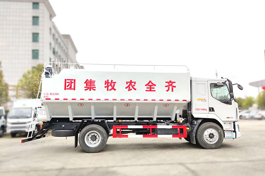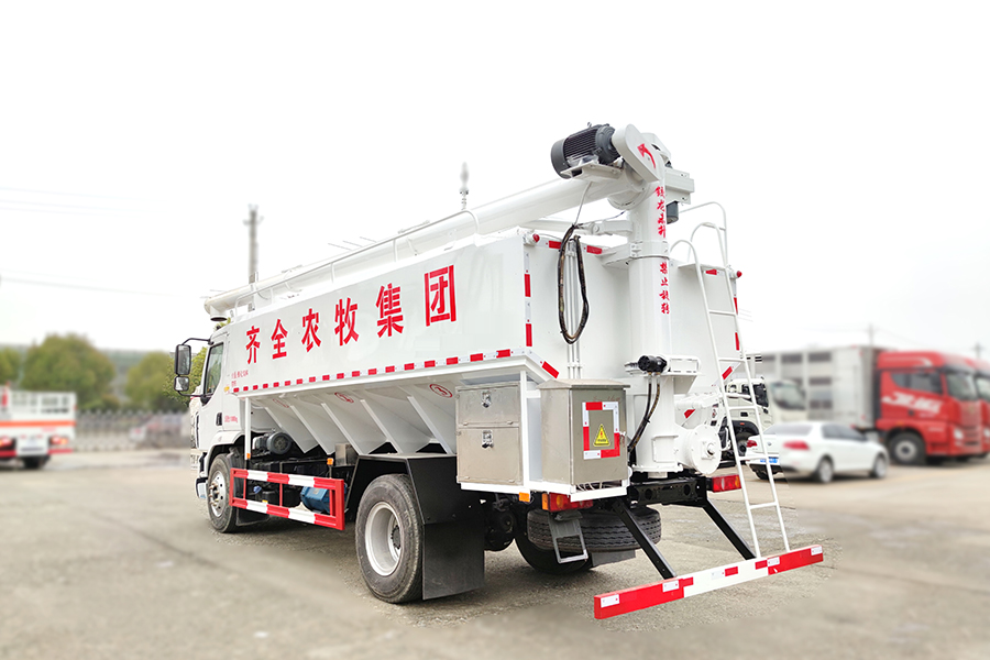 散裝飼料車的飼料罐架設在卡車的底盤上,罐頂開有進料口.頂部的一根螺旋輸送卸料管(俗稱卸料絞龍)則可自由回轉和抬升,抬升的仰角可達60度。運輸時,頂部的螺旋管平臥在罐頂;卸料時則抬起,使管端的出料口與畜禽飼養場貯料罐頂部的進料門相接,駕駛室內裝有操縱裝置(操縱裝置也可裝置在罐體尾部),卸料時通過車底的動力輸出軸和減速器來驅動螺旋,以完成卸料。目前國內主要推出3T、5T、8T、11T、15T和22T等多個噸位車型。