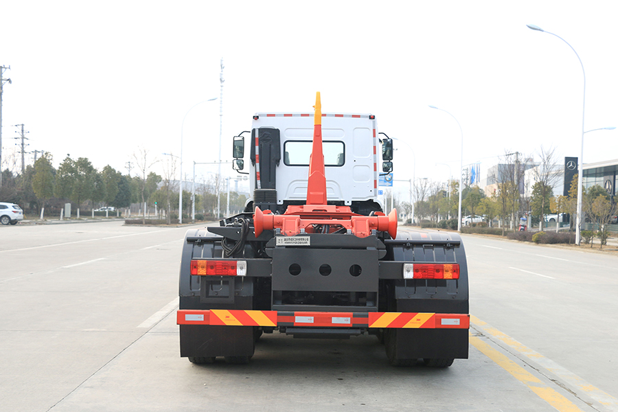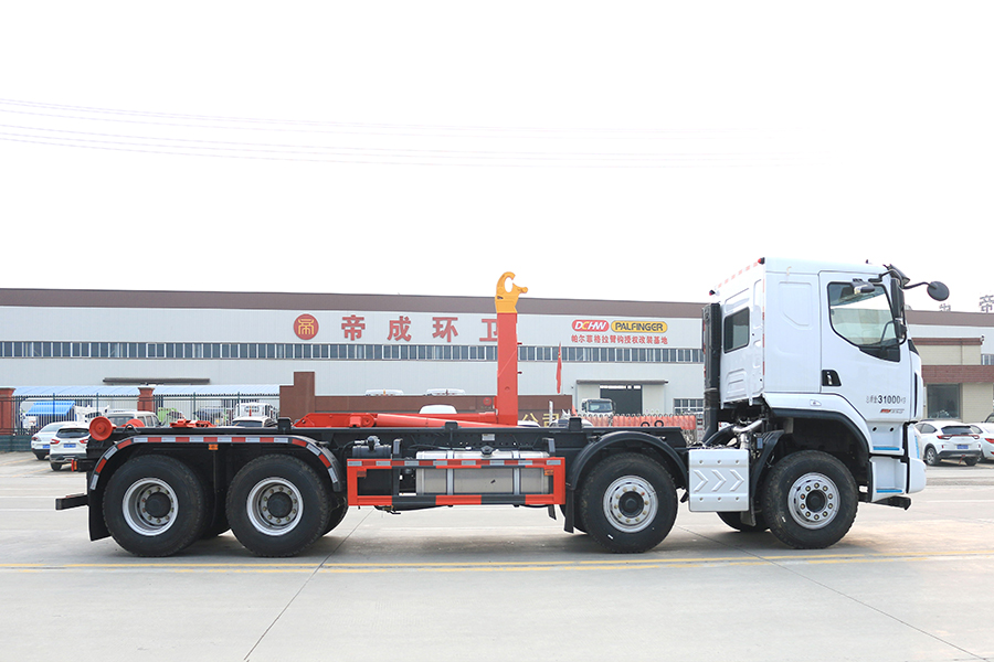 帶自卸功能,液壓操作,方便傾倒。該車的箱體部分完全由液壓系統(tǒng)來控制,在平日里可將車載垃圾箱放置到各個垃圾收集站,待垃圾收集滿后,該車可直接開赴至垃圾站,通過液壓系統(tǒng)的操控,可將垃圾車后座上加裝的勾臂放下,掛住站內(nèi)垃圾箱前端的連接點,將垃圾箱拉至車體的后座上,此時即可啟動車輛,將垃圾運送至垃圾處理站內(nèi),進行自卸式傾倒。該車最主要的優(yōu)點就是可一車配多斗,一輛車就可以維持數(shù)個垃圾收集站的運轉,效率高,且箱體為密封式設計,不會造成二次污染。