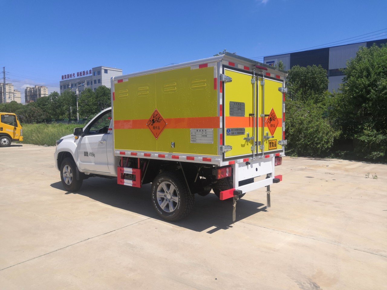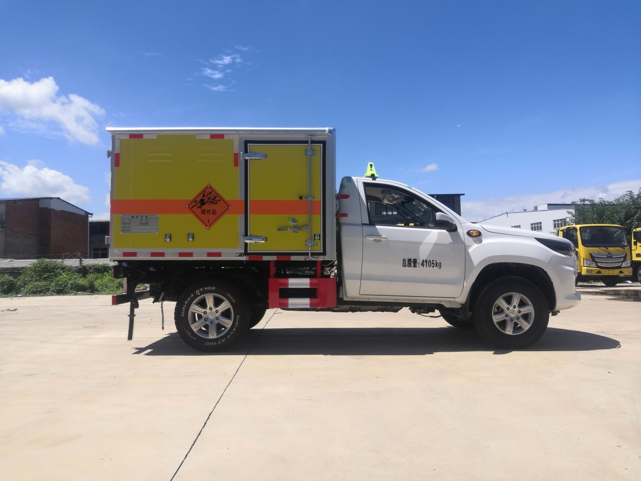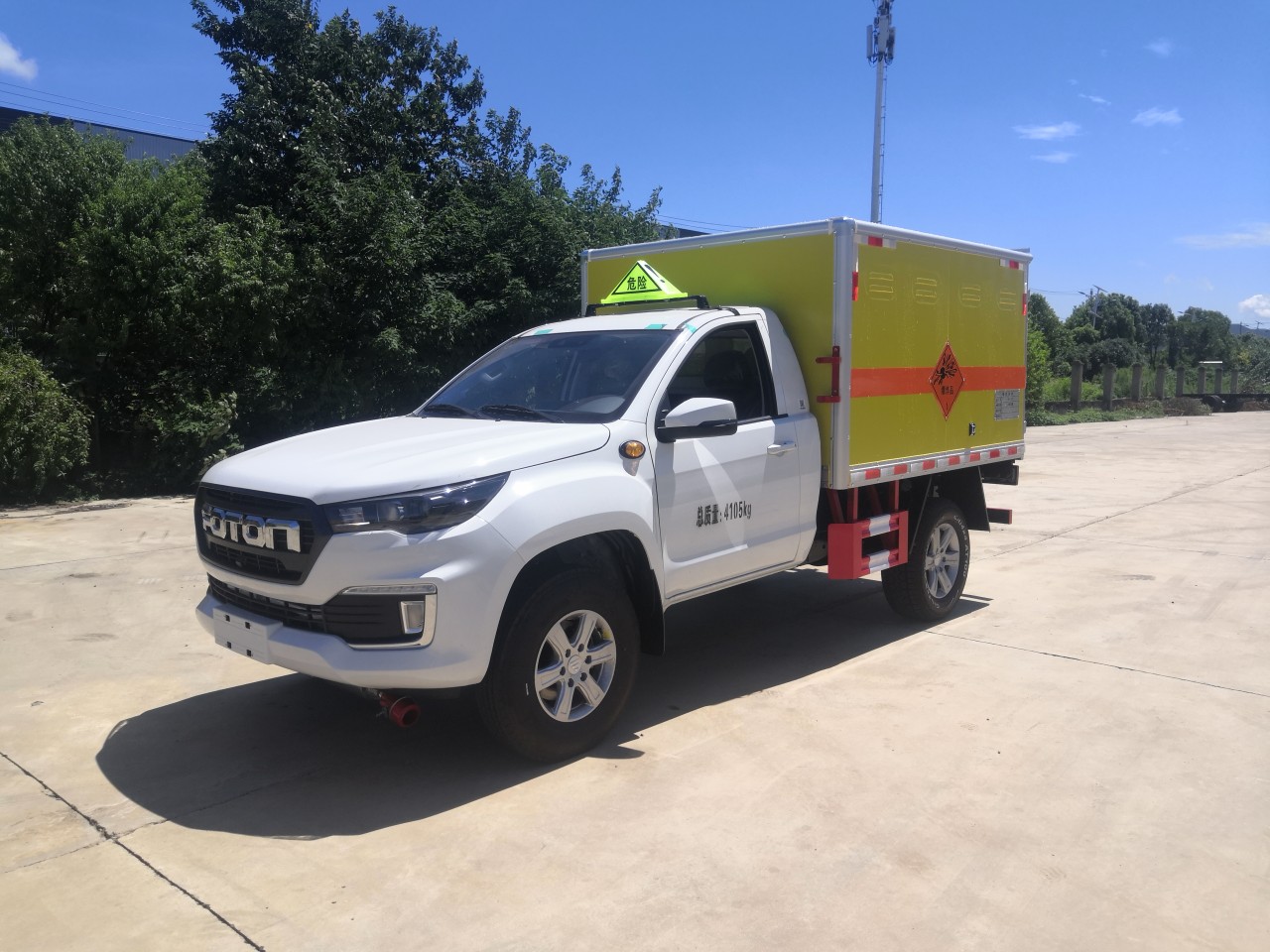 福田重載法規藍牌皮卡底盤,總質量4105kg,3110軸距,單排駕駛室,歐康柴油2.5T發動機 ,4*4驅動,前雙叉臂式結構獨立懸架+后鋼板彈簧非獨立懸架,前盤后鼓,遠近光一體透鏡大燈,有晝行燈,側轉向燈(重載法規 要求),離地間隙210mm,BA剎車輔助 ,前7.00R16后265/65R17輪胎,多功能方向盤、電動空調,藍牙、無側踏板 ,76L油箱,8吋屏幕MP5 ,4G-T-BOX,一鍵啟動